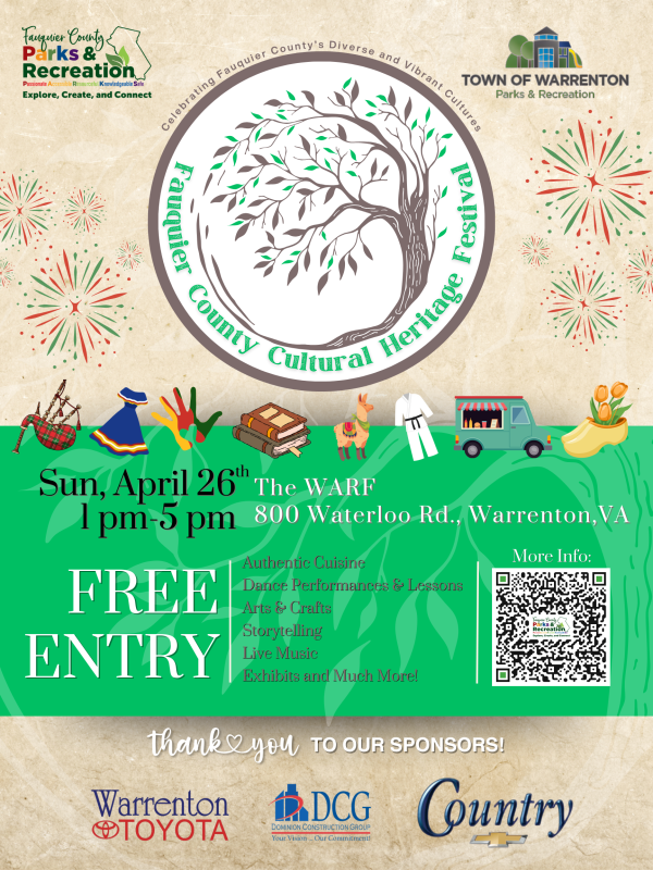 Join us for the second annual Cultural Heritage Festival in Fauquier County, organized by Fauquier County and the Town of Warrenton Parks and Recreation! This exciting event aims to celebrate and embrace the rich tapestry of cultures within our community while educating attendees about the diverse heritage we all share.
